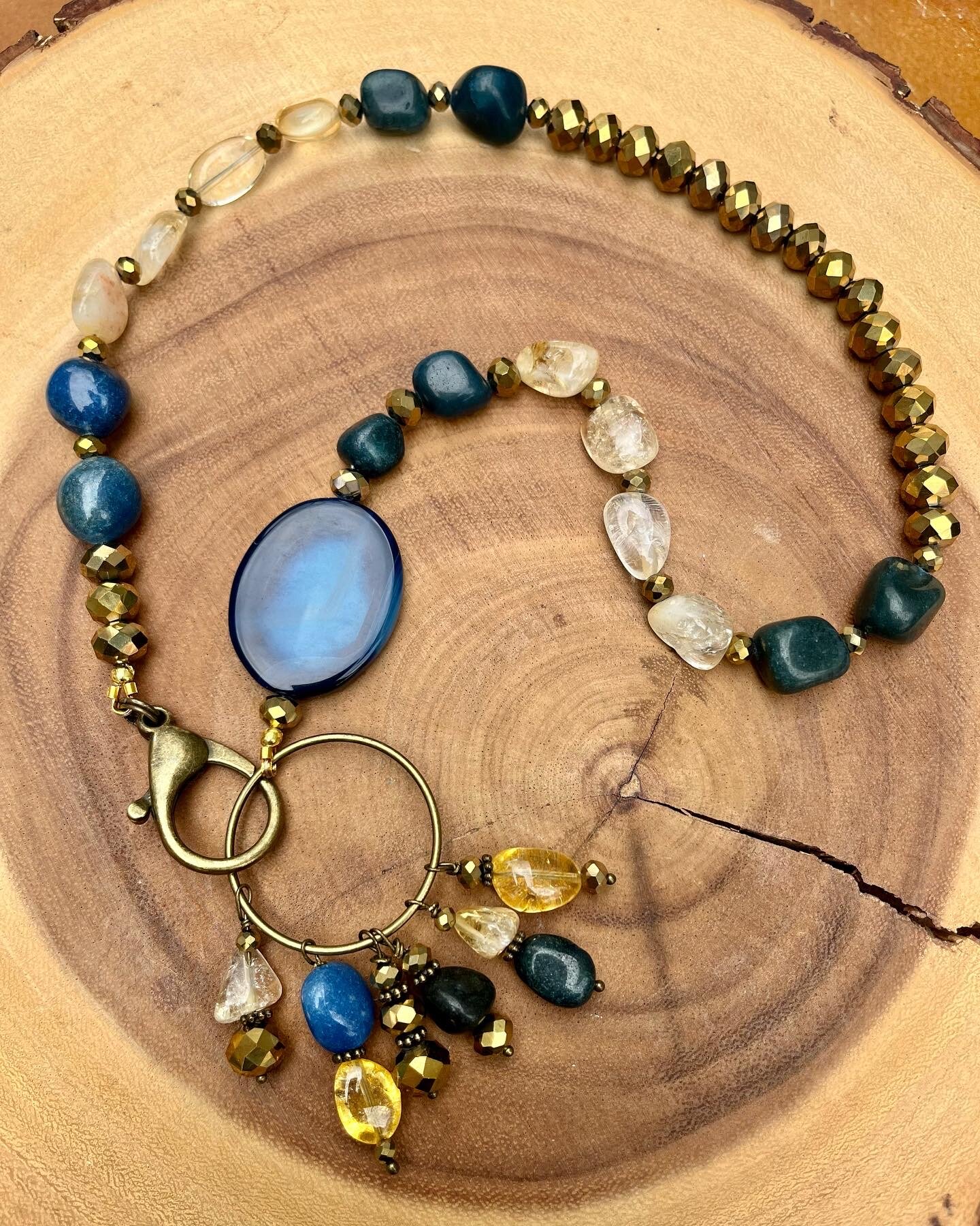 Blue agate, Citrine, Czech beads and antique bronze. Lovely and chunky with a front large accent closure. The necklace is 24” long.